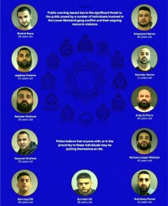 पुलिस द्वारा जारी पोस्टर में शकियल बसरा (28), अमरप्रीत सामरा (28), जगदीप चीमा (30), रविंदर शर्मा, (35), बरिंदर धालीवाल (39), एंटी सेंट पियरे (40), गुरप्रीत धालीवाल (35), रिचर्ड जोसेफ व्हिटलॉक (40), समरूप गिल (29), सुपदिश गिल (28) और सुखदीप पंसल (33) के नाम शामिल हैं। कनाडा से मीडिया रिपोर्टों में कहा गया है कि विशिष्ट कथित अपराधियों से दूर रहने की ऐसी चेतावनियां पहले कभी नहीं सुनी गई थीं, लेकिन हाल के वर्षों में इनमें वृद्धि हुई है।