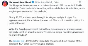 अकाली नेता ने कहा कि यह किसी भी तरह की शिक्षा नीति नहीं, बल्कि साफ तौर पर राजनीतिक नाटक है। उन्होंने सवाल उठाया कि एक तरफ सरकार छात्रों के लिए पैसे न होने की बात करती है, दूसरी तरफ विज्ञापनों पर करोड़ों रुपये खर्च किए जा रहे हैं। उन्होंने कहा कि इससे एक सीधा सवाल खड़ा होता है, शासन या सिर्फ दिखावा? हरसिमरत कौर बादल ने मांग की कि वादा किए गए 271 करोड़ रुपये तुरंत जारी किए जाएं और हर योग्य छात्र के खाते में सीधे ट्रांसफर किए जाएं।